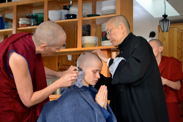 Nach knapp zwei Jahren Training bin ich in der Sravasti Abbey ordiniert worden – der schönste Tag meines ganzen Lebens. Die Ordination begann mit einer Kopfrasur. Dann legte ich meine normale Kleidung ab und bekam eine rote Robe. Es folgte eine zweistündige Zeremonie, bei der ich mich dem Leben einer Nonne verpflichtete, ohne Familie und Sexualität. Gleichzeitig versprach ich, meiner Lehrerin zu folgen.